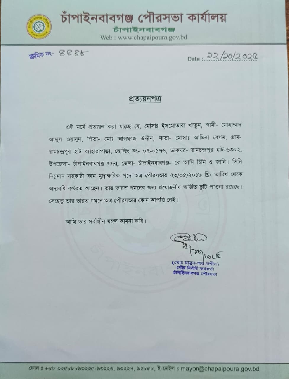 | ১৯ | ১৬-১০-২০২৫ | মোসাঃ ইসমোতারা খাতুন, নিম্নমান সহকারী কাম মুদ্রাক্ষরিক এর ভারত গমন সংক্রান্ত প্রত্যয়নপত্র। | Click here to view this document |