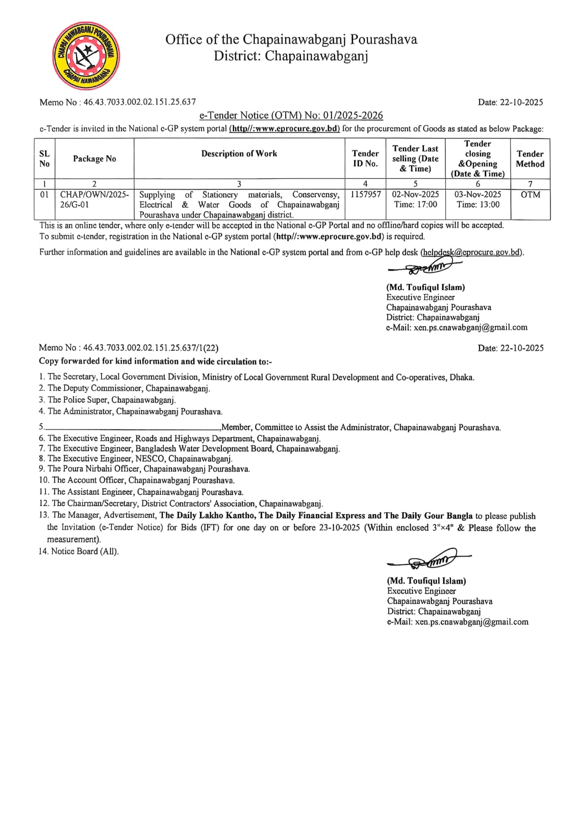 | ১৫ | ২১-০৭-২০২৫ | চাঁপাইনবাবগঞ্জ পৌরসভা কার্যালয় ব্যাংক বুথ ভাড়া সংক্রান্ত বিজ্ঞপ্তি | Click here to view this document |